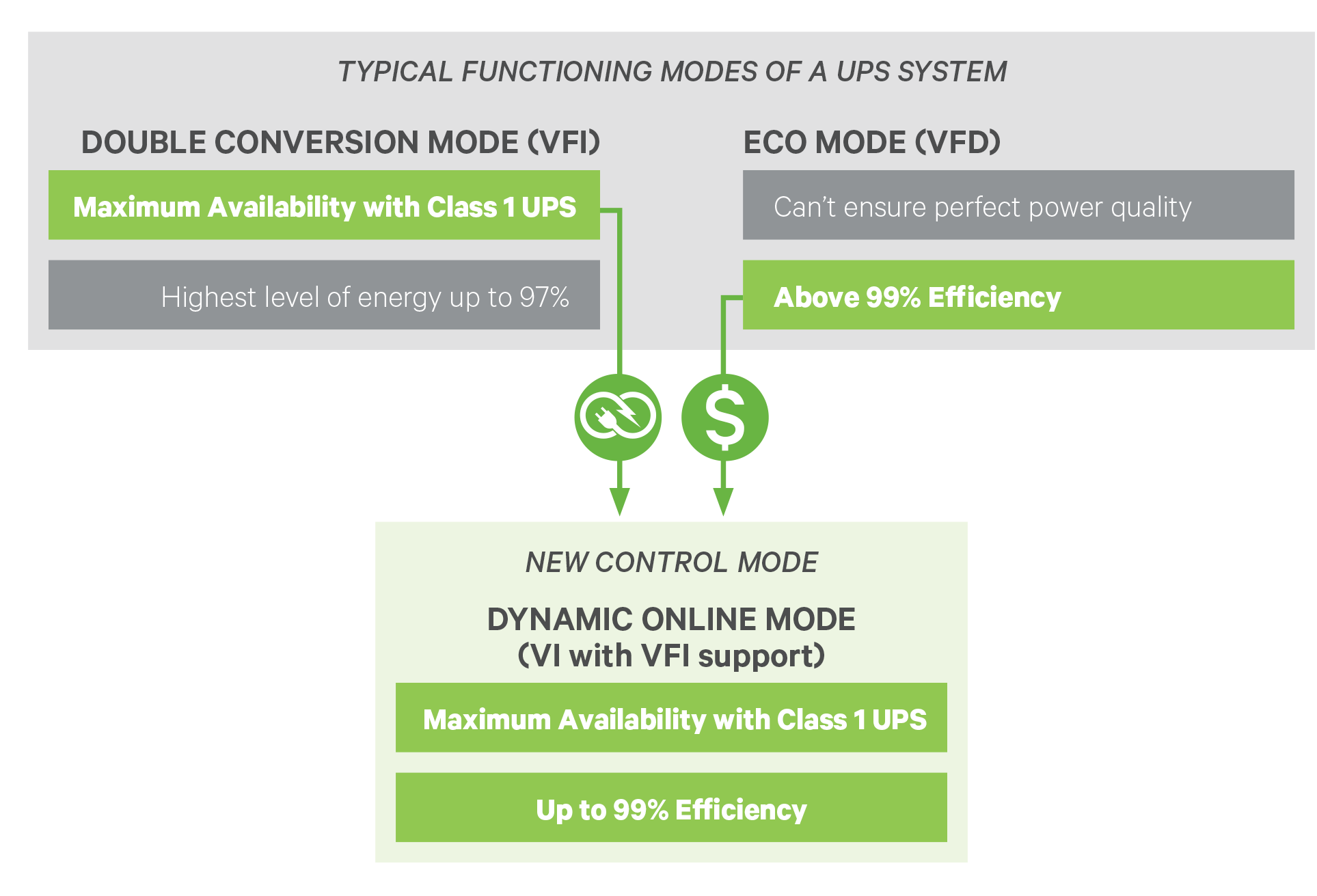 • 3 MODES OF OPPERATING EFFICIENCY: Double Conversion (97%), Dynamic Online (99%) and ECO Mode (>99%)