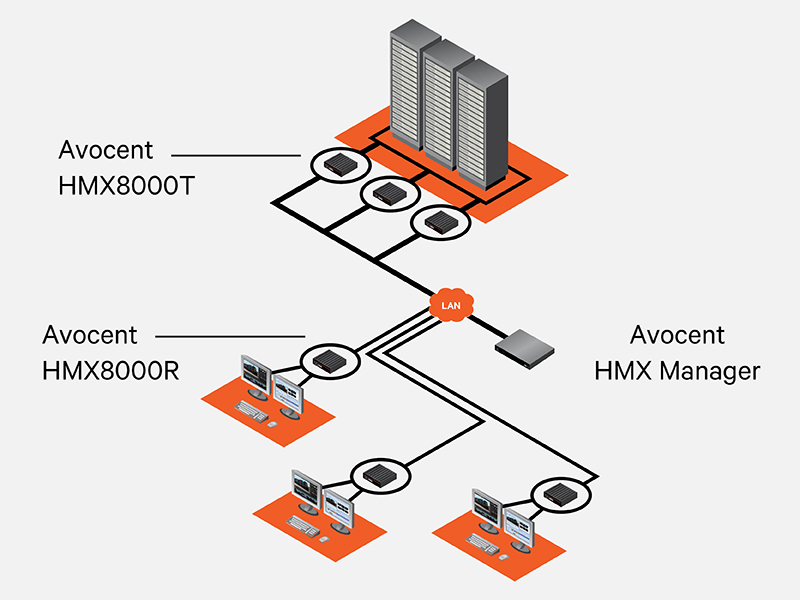 The Vertiv Avocent HMX8000 IP keyboard, video and mouse (KVM) system is a high-performance extender offering 4K video over a single fiber connection, along with audio and universal serial bus (USB). It delivers pixel-perfect, color-accurate picture quality with 4K resolution at 60Hz using the USB 2.0 specification for fast switching, making it the preferred solution for broadcasting, post production, and other applications where high resolution and zero latency are required.