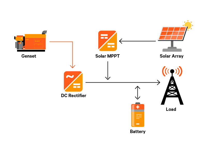 In locations where a diesel generator is the only option as the primary energy source, high capacity battery strings can be deployed in conjunction with the generator to provide energy storage. This will decrease generator run time and reduce overall operational and maintenance costs. Further savings can be realized when a solar array is utilized at the site.