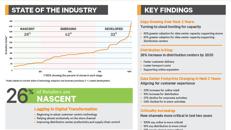 • Focusing on the customer experience requires speed and agility across the organization, especially in the application of new technologies. Retailers will turn away from infrastructure that is not easily integrated, scalable or modular, due to the focus on cost, speed of deployment, and future flexibility.