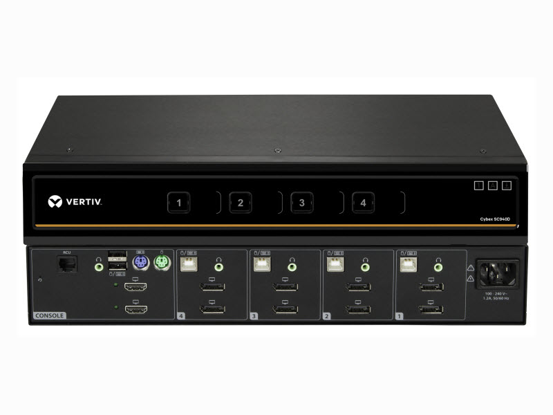 The Cybex™ SC940D secure desktop KVM is designed to meet the stringent specifications of the U.S. government and certified to the NIAP / Common Criteria Protection Profile for Peripheral Sharing Switch version 3.0.