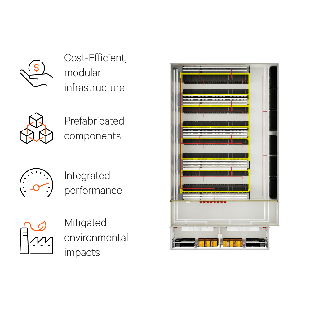 • REDUCED ENVIRONMENTAL IMPACT: By utilizing modular construction, steel, electrical power, and streamlined logistics, it helps reduce direct environmental impacts compared to traditional data centers.