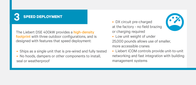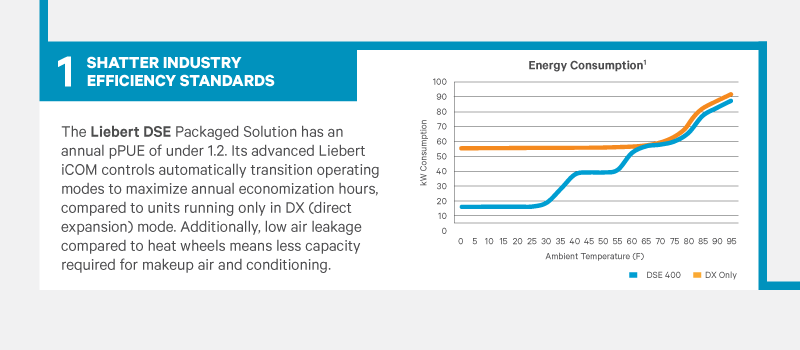 The Liebert® DSE™ Packaged Solution is the world's most efficient and reliable water-free cooling system for data centers. Available as a 400kW packaged solution for building perimeter or rooftop installation, the Liebert DSE 400kW provides a very competitive total cost of ownership solution.