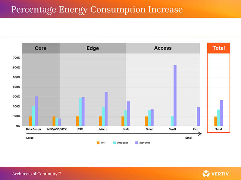 However, more than 90 percent of respondents believe 5G will result in higher energy costs and are interested in technologies and services that improve efficiency. This is consistent with internal analysis by Vertiv, which finds the move to 5G is likely to increase total network energy consumption by 150-170 percent by 2026, with the largest increases in macro, node and network data center areas.