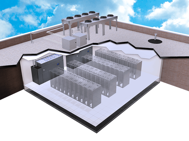 The unit’s variable-speed evaporator fans, condenser fans and digital scroll compressors automatically adjust to match IT load and optimize energy usage. The unit can engage backup DX for additional capacity if needed.