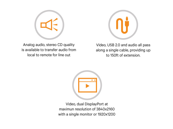 The LV4000 Series extenders use an uncompressed system whereby every pixel of every frame is sent without loss. DVI-D digital video is supported at up to 1920x1200 on single or dual monitors. HDMI video and audio can be extended with the correct adapter cable, although HDCP and CEC are not supported. The LV 4000 also supports a comprehensive range of peripherals including graphics tablets, touchscreens, jog shuttles, joysticks, 3D explorers, CD audio, USB mass storage, keyboard and mouse and other USB devices.