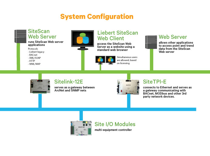 Liebert® SiteScan Web provides monitoring for critical support equipment — whether located in the next room or in a facility on the other side of the country. This web-based data center monitoring system provides centralized oversight of cooling, power, leak detection, control panels, and other critical equipment. Features include real-time monitoring, event management, data analysis, and custom trend reporting.