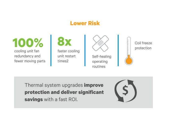 Achieve 30% annual return on investment and improve data centre efficiency and protection. From cooling unit retrofit parts to turnkey installed upgrade services, we can help you calculate ROI, configure the right solution, obtain energy rebates, manage installations and continually optimise your cooling systems.