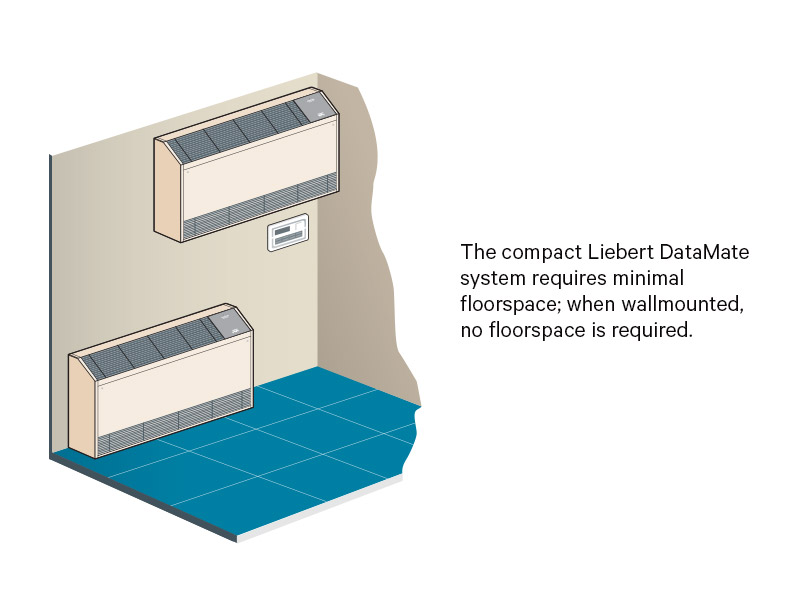 Liebert DataMate is a small footprint cooling system for 7x24 temperature and humidity control in network closets, computer rooms and other small spaces. Its low profile permits floor-mount or wall-mount installation, and requires little or no floor space.
