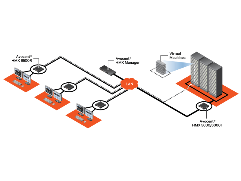 When high resolution with no latency is needed, the Avocent® HMX5000/6000/8000 High Performance KVM solutions provide you with what you are looking for. Being the leader in KVM switching, Avocent’s HMX High Performance KVM are designed to deliver an “at-the-PC” experience for broadcast, live sports venues, control rooms, and governmental organizations. The Avocent HMX 5000/6000/8000 series can be deployed in multiple ways: as point-to-point extenders directly connected or, over a network; point-to-multi-point extension; or as a fully-matrixed KVM solution.
