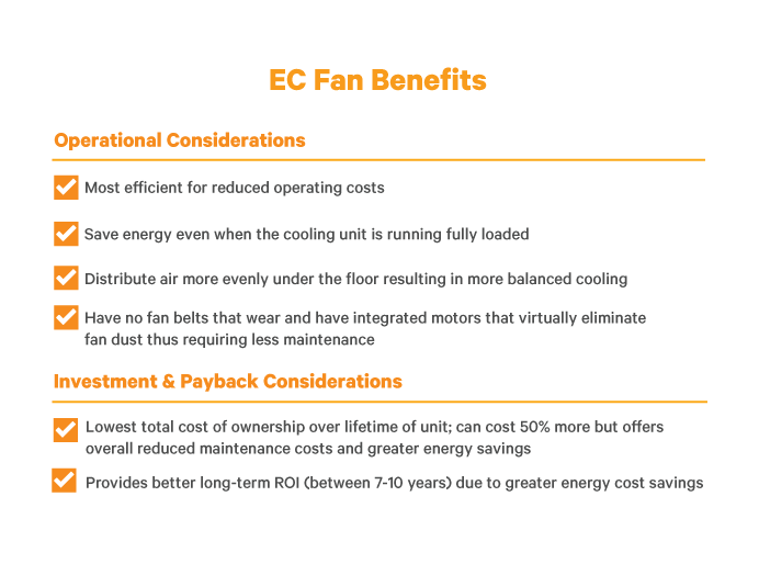 Improve energy efficiency and overall system reliability in your data center by utilizing the newest technology for your thermal infrastructure. Electrically commutated (EC) fans offer innovative technology with exceptional value. When integrated with continuous speed control across the full operating range of thermal management units, EC fans provide a simple, cost-effective way to introduce energy-efficient technology by regulating airflow and reducing fan input power.