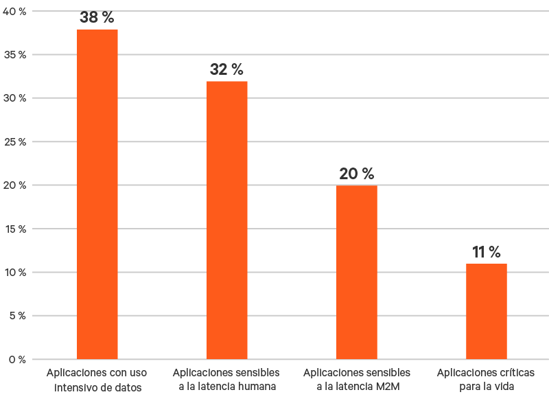 - Los casos prácticos de aplicaciones sensibles a la latencia máquina-máquina suelen requerir una latencia aún menor que los casos prácticos sensibles a la latencia humana. Esto se debe a la velocidad a la que las máquinas pueden procesar datos. Los principales casos prácticos en esta categoría incluyen las redes y los sistemas de seguridad inteligentes. Uno de cada cinco participantes (20 %) afirmó que sus inversiones en tecnología edge estaban motivadas por casos prácticos de aplicaciones sensibles a la latencia máquina a máquina.