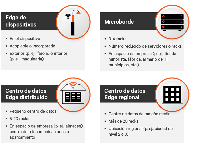 Los arquetipos del Edge permiten a las organizaciones precisar su estrategia Edge, determinando qué modelos de centro de datos de Edge son necesarios para los diferentes casos prácticos. Dependiendo de los requisitos específicos del caso práctico, las redes Edge pueden incluir todos o algunos de los modelos de Edge computing definidos en el informe Arquetipos Edge 2.0: modelos de infraestructura Edge listos para su despliegue (Figura 7).