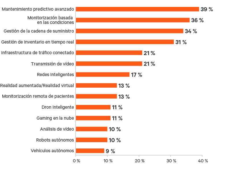 La reducción del tiempo de inactividad de los equipos de fabricación y la optimización de la cadena de suministro fueron los casos prácticos más populares que impulsaron la inversión en Edge. El mantenimiento predictivo fue el principal caso práctico citado por los participantes (39 %), seguido del mantenimiento basado en la condición (36 %), la gestión de la cadena de suministro (34 %) y la gestión del inventario en tiempo real (31 %) (Figura 8).