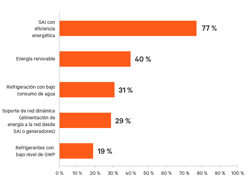Los participantes van más allá de las tecnologías de eficiencia energética y adoptan tecnologías de sostenibilidad más disruptivas, como la energía renovable y el soporte dinámico de red. Para la refrigeración de precisión del Edge, las tecnologías de bajo consumo de agua y de bajo potencial de calentamiento atmosférico (PCA) parecen estar ganando popularidad (Figura 11).