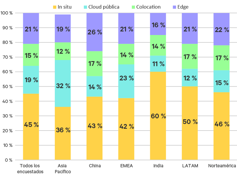 India y LATAM tienen el mayor porcentaje de TI en las instalaciones, con un 60 % y un 50 % respectivamente (Figura 3). Asia-Pacífico tiene el mayor porcentaje de recursos en la nube pública, con un 32 %. China tiene el mayor porcentaje de recursos en el extremo de la red (26 %). En cinco años, los participantes de China esperan que, de media, el porcentaje de la infraestructura de TI en el extremo de la red alcance el 31 %. Los participantes de LATAM esperan ver el mayor cambio en el Edge, del 21 % en 2021 al 30 % en 2026.