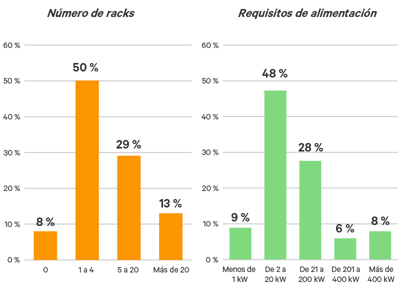 La “típica” ubicación edge alberga ahora entre uno y cuatro racks de equipos informáticos con necesidades de energía de entre 2 y 20 kW, aunque son comunes los centros más grandes. El 42 % de las ubicaciones está formado por más de cuatro racks de equipos informáticos y tiene unas necesidades de energía superiores a 20 kW (Figura 4).