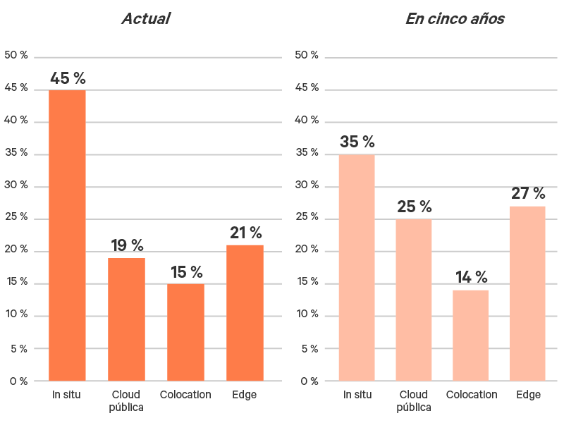 La llegada de nuevas ubicaciones edge aumentará la dependencia en el extremo de la red. Los participantes esperan que el porcentaje de infraestructura de TI desplegada en el Edge aumente del 21 % actual al 27 % en cinco años. Esperan que el porcentaje de infraestructura informática centralizada en las instalaciones disminuya un 22 %, mientras que el porcentaje de recursos en la nube aumentará un 32 % y un 29 % en el Edge (Figura 2).