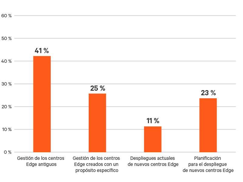 - En las prácticas actuales de gestión del Edge se observan vulnerabilidades similares. Un tercio de los encuestados (33 %) confía en el personal de TI situado en las instalaciones de edge o cerca de ellas para dar soporte a las operaciones, una estrategia que podría crear problemas a medida que aumente el número de despliegues de edge. Un 25 % adicional de las ubicaciones edge dan soporte con personal informático centralizado, lo que requiere desplazamientos a las ubicaciones remotas para el mantenimiento regular y la resolución de problemas. Esto también puede suponer una carga para el personal de TI a medida que aumenta el número de centros y puede prolongar de forma significativa el tiempo de inactividad en caso de fallo.
