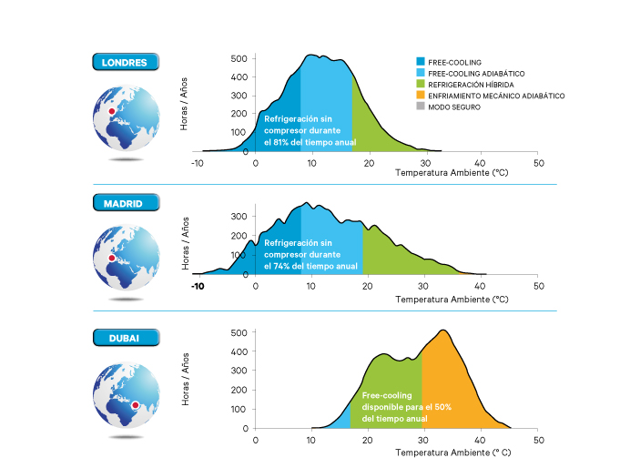El chiller adiabático con freecooling Liebert AFC combina tres tecnologías de refrigeración clave: adiabática, freecooling y refrigeración mecánica.