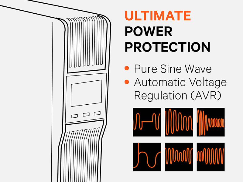 | 3000VA / 2700W | Nominal: 120VAC / Range: 75-146VAC | 120VAC (100/110/115/125VAC user-configurable) | Up to 96% (Normal Mode) | Input: L5-30P; Output: 6 x 5-15R, 1 x L5-30R | 3.5 in | 17.2 in | 24.8 in | 70.8 lb |