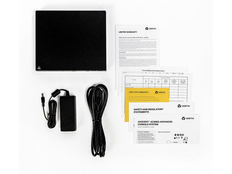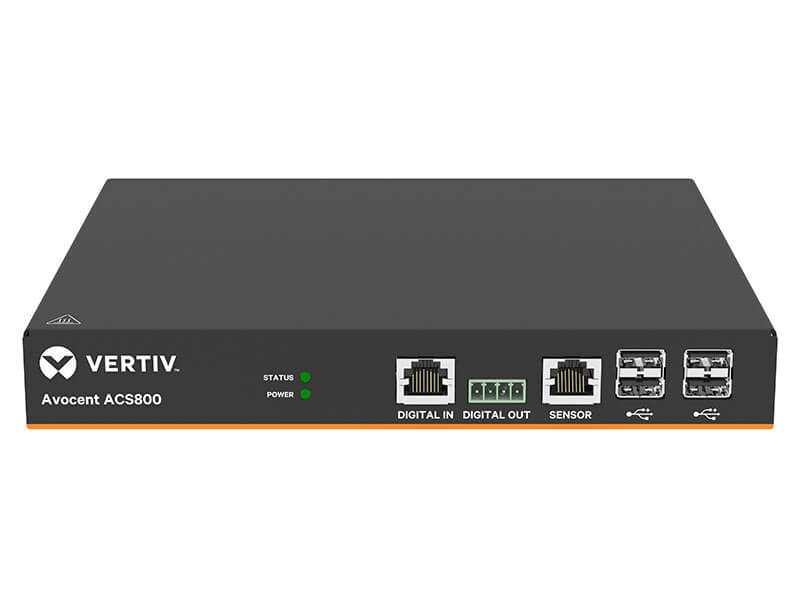 The Vertiv Avocent ACS 800 Serial Console system delivers secure in-band and out-of-band visibility and control for IT equipment even in the event of a network outage. The system acts as a secure gateway and single point of entry with monitoring and management capabilities for connected devices. Zero-touch provisioning makes the Vertiv Avocent ACS 800 easy to install and configure, even with most third-party equipment. The console has four USB ports to support external devices and an environmental sensor port for temperature, humidity, differential pressure and leak sensors. The Vertiv Avocent ACS 800 provides secure equipment access and control for banks, retail locations, manufacturing facilities, educational institutions, and other traditional and non-traditional edge locations.