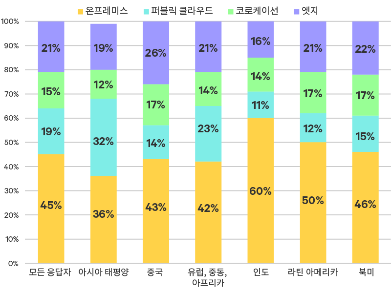 인도와 라틴 아메리카는 현재 온프레미스 IT의 비중이 각각 60%와 50%로 가장 높았습니다(그림 3). 아시아 태평양 지역은 퍼블릭 클라우드에 배치한 리소스 비율이 32%로 가장 높았습니다. 중국은 엣지에 배치한 리소스의 비율이 가장 높았습니다(26%). 평균적으로, 중국의 응답자들은 5년 이내에 엣지에 배치되는 IT 인프라의 비율이 31%까지 증가할 것으로 예상했고, 라틴 아메리카의 응답자들은 엣지 전환 비율이 2021년의 21% 수준에서 2026년에는 30%까지 상승하는 가장 큰 폭의 변화를 예상하고 있었습니다.