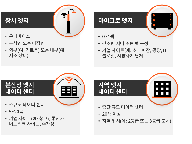 엣지 구조요소는 서로 다른 활용 사례에 필요한 엣지 데이터 센터 모델의 결정 과정을 도와주므로, 조직은 엣지 전략을 명확하게 설명할 수 있게 됩니다. 특정 활용 사례의 구체적 요구 사항에 따라, 엣지 네트워크는 구조요소 2.0: 즉시 배치 엣지 인프라 모델 보고서(그림 7)에 정의되어 있는 엣지 컴퓨팅 모델의 전부 또는 일부를 포함할 수 있습니다.