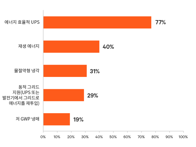 엣지의 운영 효율성을 향상시키는 가장 쉬운 방법은 에너지 효율이 높은 기술을 배치하는 것입니다. 응답자의 3/4 이상(77%)이 자사의 엣지 사이트를 위해 에너지 효율적인 UPS 시스템을 이미 배치했거나 배치할 계획입니다. 새로운 중형 이중 변환 UPS 시스템은 상용 전력 사용 시 전력 조절과 관련된 에너지 손실을 줄여주는 동적 온라인 최적화를 통해 98% 이상의 운영 효율성을 달성할 수 있습니다. 이 시스템은 들어오는 전력 품질이 저하될 경우 이중 변환 모드로 빠르게 전환함으로써 장비를 보호합니다.