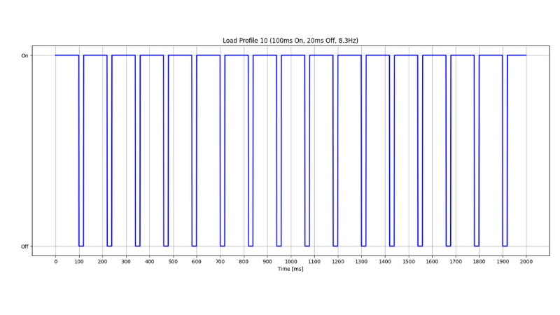 Load profile: 100ms ON, 30ms OFF (8.3 Hz)