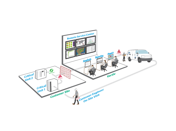 Usługi Vertiv LIFE Services zapewniają bieżącą widoczność krytycznych systemów oraz możliwość wczesnego wykrywania anomalii i bezpośredniej reakcji na alarm. Zdalna diagnostyka systemów umożliwia odpowiednie przygotowanie inżynierów i szybkie, precyzyjne oraz bezpieczne przywrócenie prawidłowego działania sprzętu.