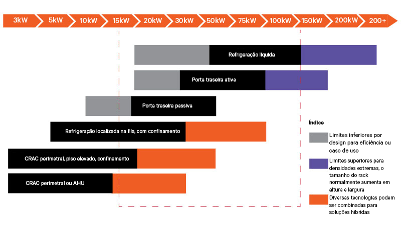 Há diversas opções em termos de tecnologias para gerenciamento térmico a serem consideradas dependendo dos requisitos do design dentro de uma faixa específica de densidades dos racks. À medida que as densidades chegam perto ou ultrapassam 30 quilowatts (kW), a refrigeração a ar pode não ser adequada para manter a temperatura de trabalho do processador (temperatura do invólucro) e a refrigeração líquida torna-se a única opção para remover calor de forma eficiente.
