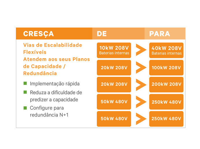 O UPS Trifásico Liebert EXM, está disponível em opções de escalabilidade de potência ou capacidades fixas de10kVA/kW a 250kVA/kW. Através de seu design modular o Liebert EXM dispõe de módulos de 20kW para operar de 10 a 200kVA/kW em 208V ou 50kW para operar de 50 a 250kVA/kW, quando alimentado em 480V. O certificado ENERGY STAR® garante a mais alta eficiência do mercado de médio porte, sua eficiência de 96% pode ser aprimorada para 99%, operando em Eco Mode. O Liebert EXM é um produto integrado que traz maior capacidade em menor espaço físico.