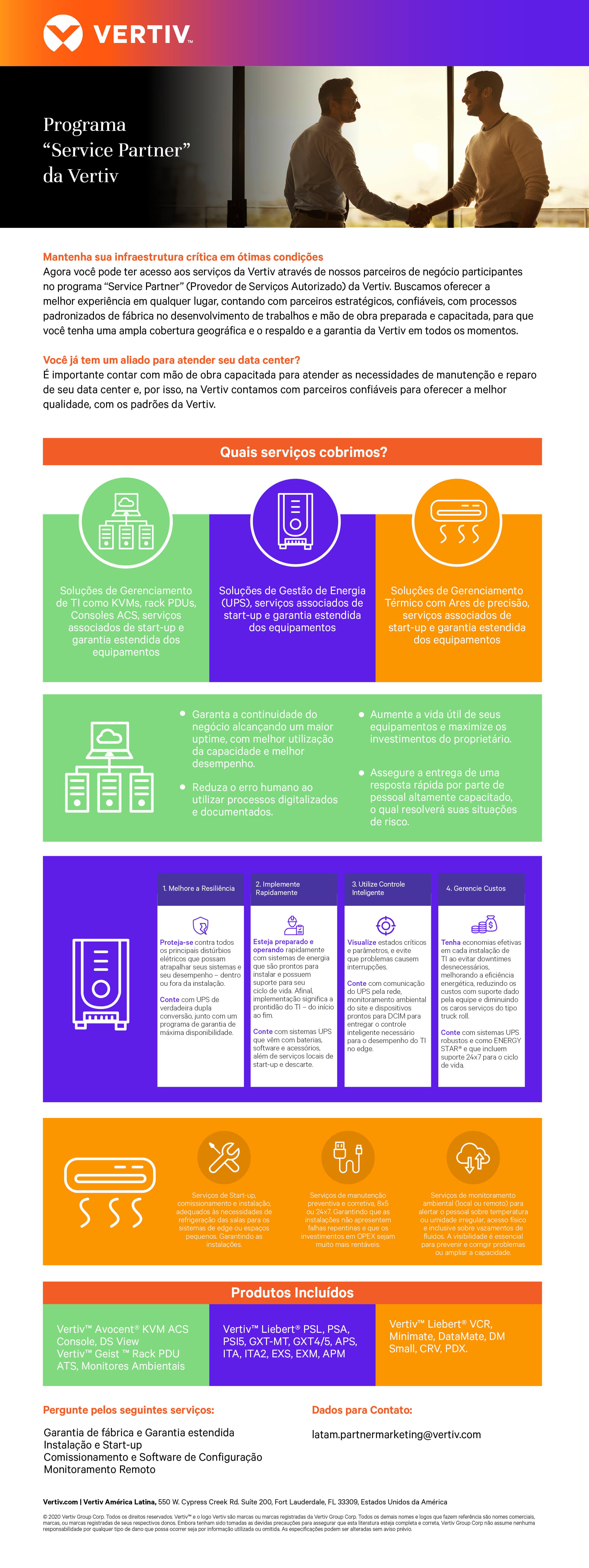 Os Canais Autorizados de Serviços, ou Service Partners, são nossos parceiros estratégicos, confiáveis, com processos padronizados da VERTIV no desenvolvimento e execução de trabalhos, mão de obra preparada e capacitada, que podem cobrir a área geográfica do pais, oferecem suporte e garantia dos serviços realizados em qualquer momento, além de darem agilidade na assistência aos seus tickets.