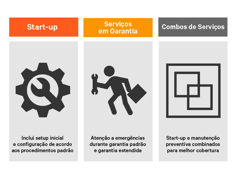 Instalação, comissionamento, start-up, manutenção preventiva, peças de reposição, serviços de emergência 24 horas por dia, 7 dias da semana e monitoramento e diagnósticos remotos são apenas uma seleção dos principais serviços que contribuem para garantir a continuidade do negócio.
